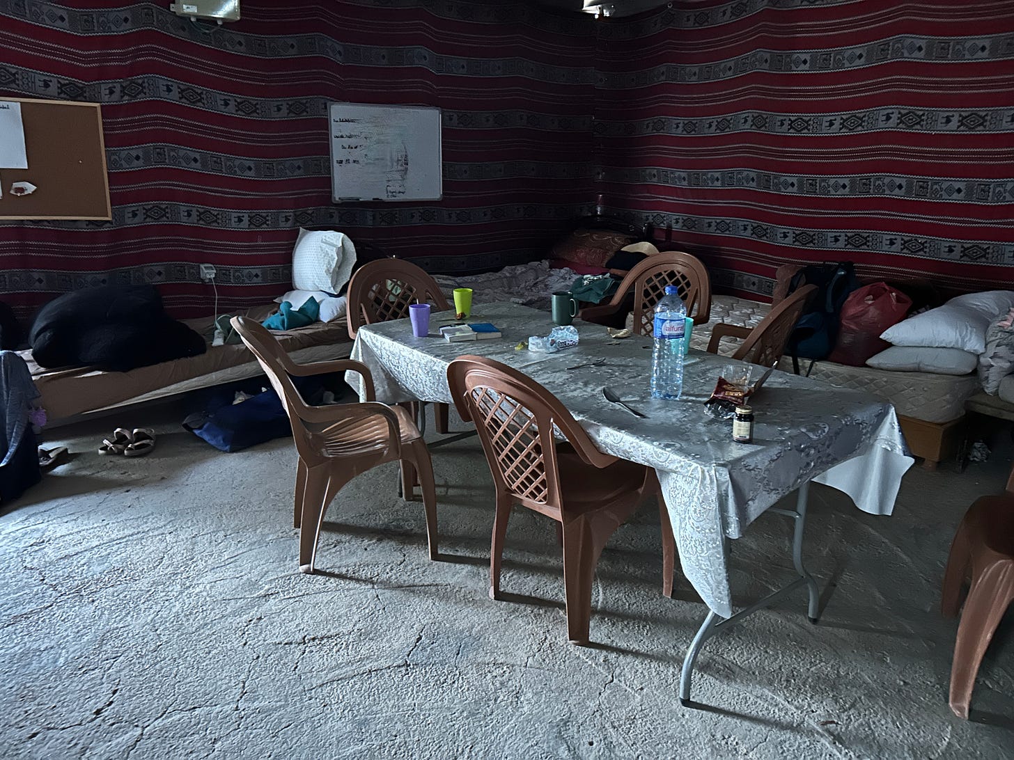 All spaces in the two madhafas are communal; as one activist explains to me, the only place where you can get any reliable privacy is in the bathroom, and only for a short time. In the field, no one is allowed to be alone because lone activists are easy targets for violence. On the morning that I arrived for my first day shift, a Jewish Israeli man who was in Ras for the first time had been assaulted with a club. He had apparently been invited to a private “heart-to-heart” with one of the settlers and he was cocky enough to think he’d have some influence; as soon as the settler got him separated from the group, he started beating him.