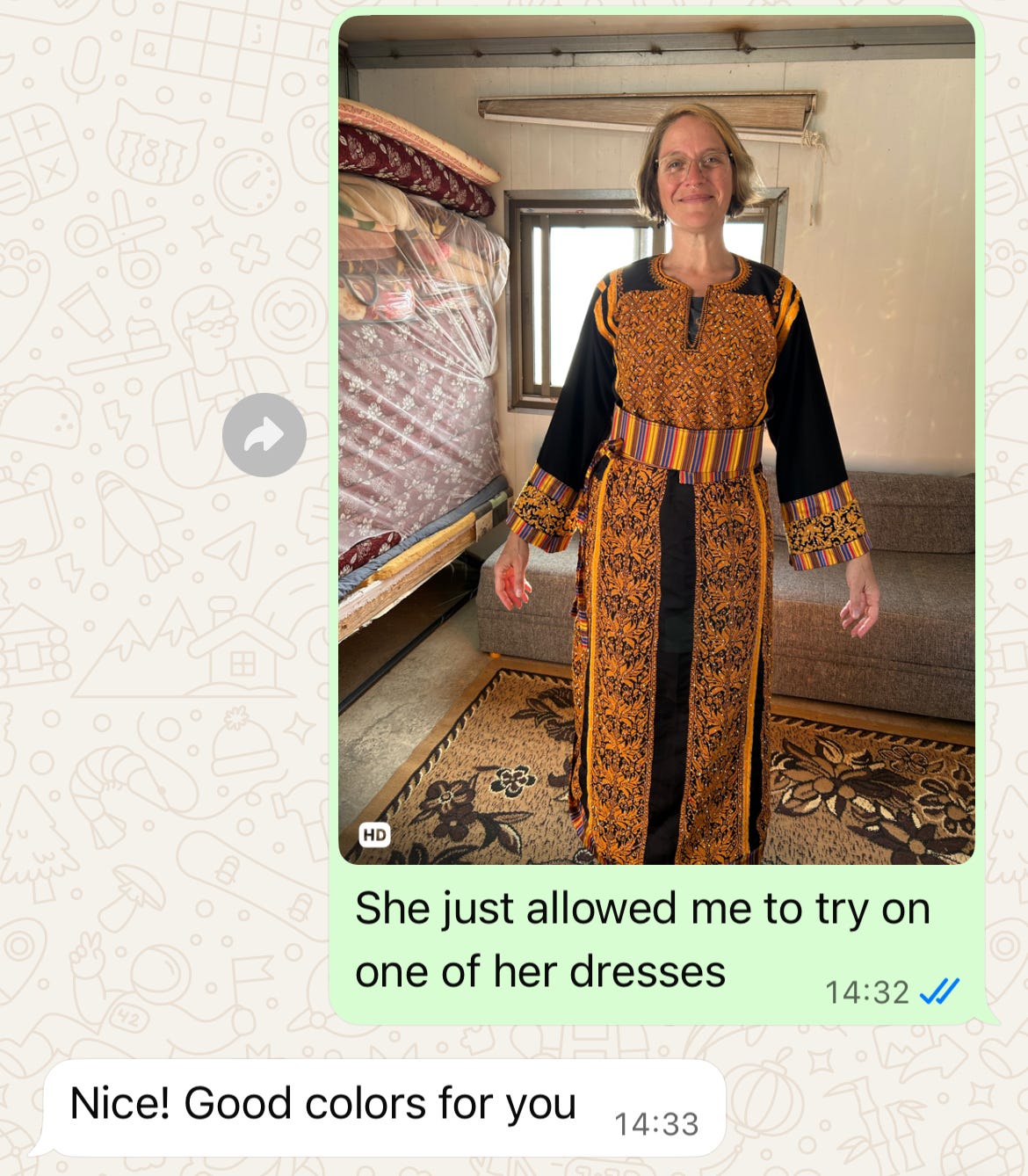 We continue in this way, with my mother now included in the visit from 6,000 miles away. Zeinab takes a traditional Palestinian embroidered dress out of a chest and invites me to try it on.