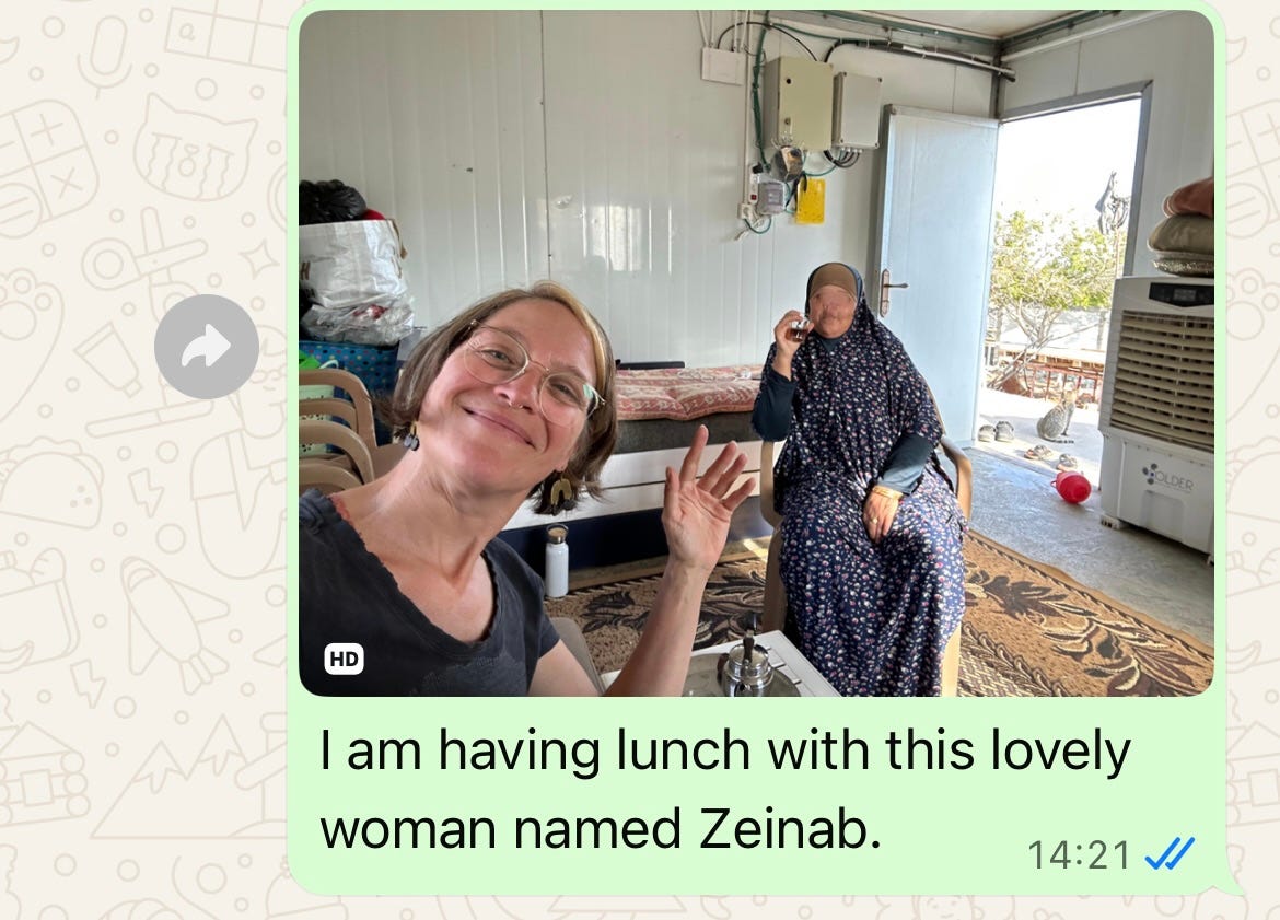 At Zeinab’s home, while we are eating and chatting, I get a reminder on my phone: It’s time for my daily “thumbs up” message to my mother to let her know that I’m ok. I ask Zeinab if it would be alright for me to send a picture of the two of us in lieu of the basic emoji.